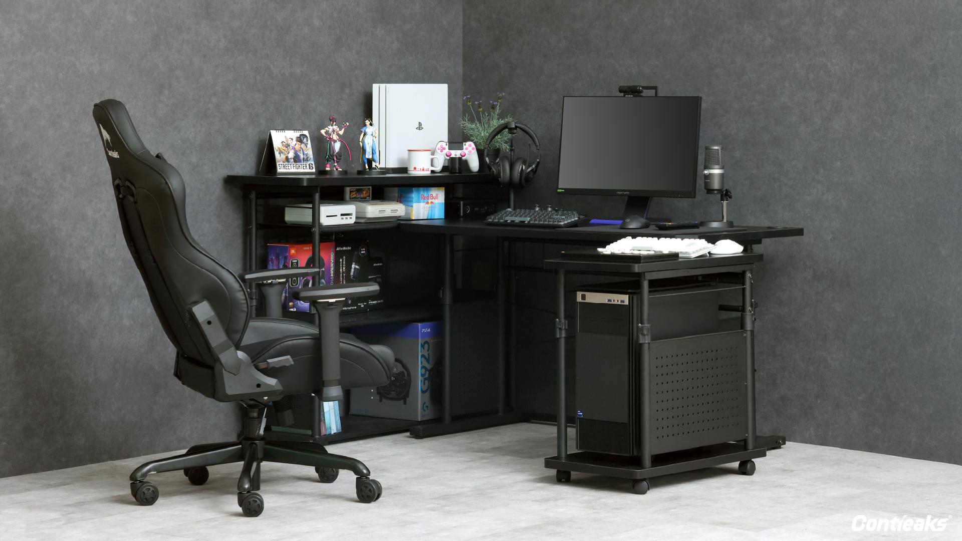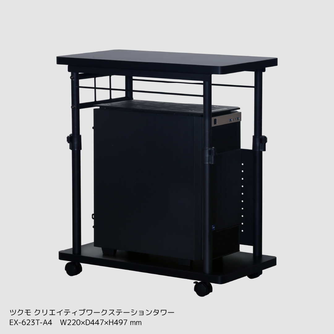 CTGシリーズは、天板の高さを変えられるので、デスクとチェアをラックやワゴンで囲むように配置することで、お部屋にコックピットのような環境を構築することができます。