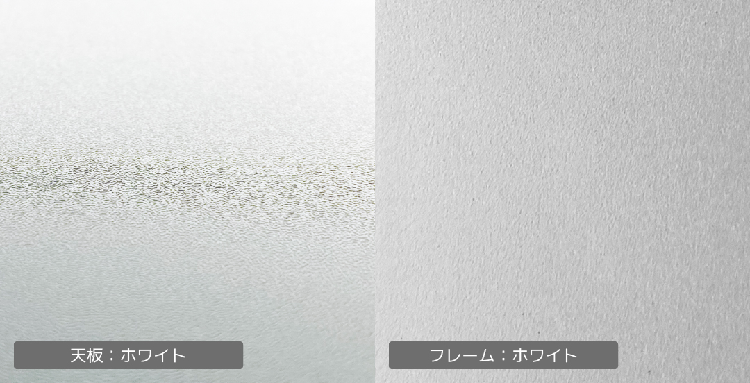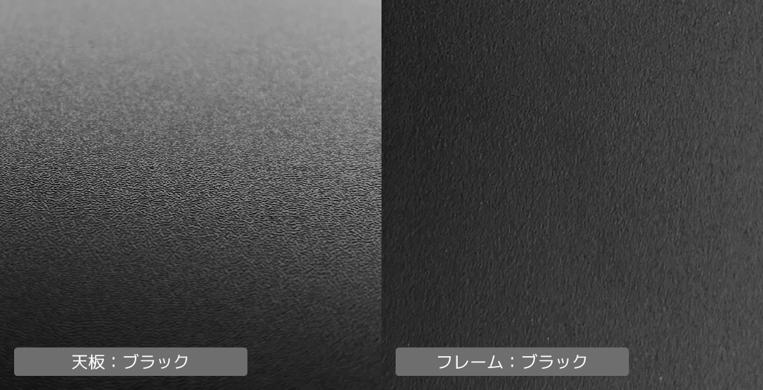 天板は”メラミン樹脂”、梨肌のエンボス感ある表情。スチールフレームは、粉体塗装しマットな質感に仕上げました。