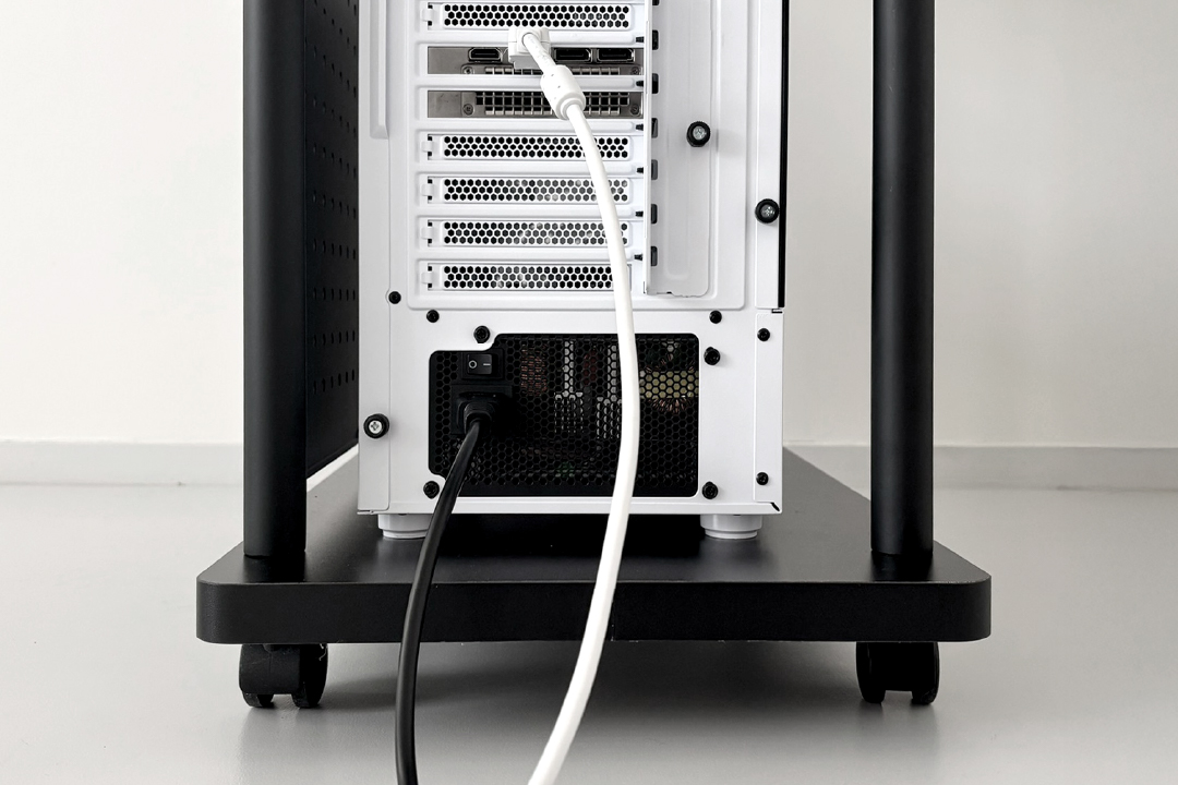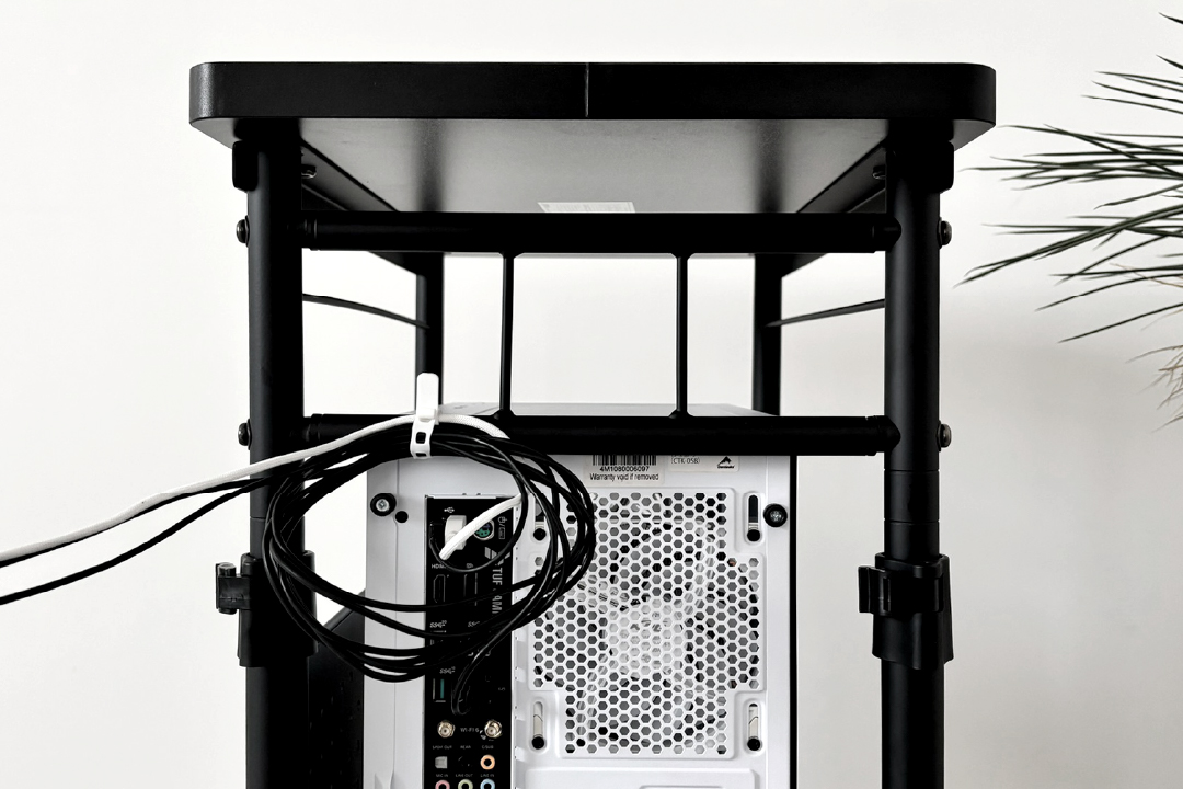 パソコン設置面の背側は、電源ユニットへのケーブルの差し込みしやすく、排熱の妨げにならないフルオープン仕様になっています。