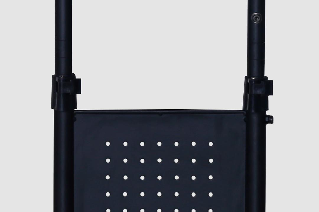 プレイヤーの要望から生まれた天板サイズ、パイプを樹脂ストッパーで固定する天板の昇降機能を搭載。