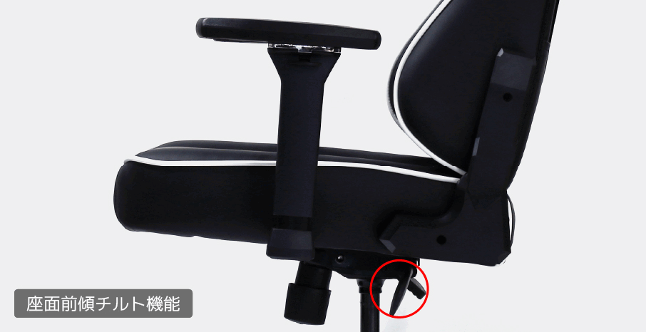 座面下の左側パドルレバーを回すと、座面が5度前傾するチルト機構を搭載した座面下金具を採用。