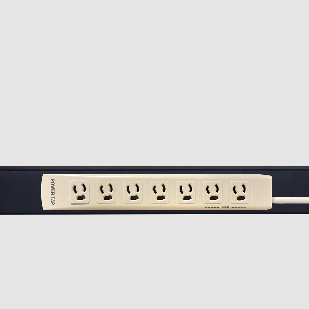 デスクの足と補強フレームにマグネット式の電源タップが取り付けることができます。