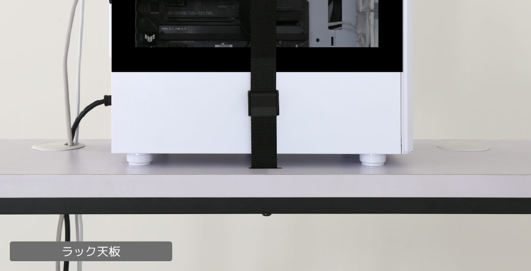 ラック天板には、地震や揺れなどでパソコンの落下を防止するベルト穴を備えています。(※ベルトは別途お買い求めください。)