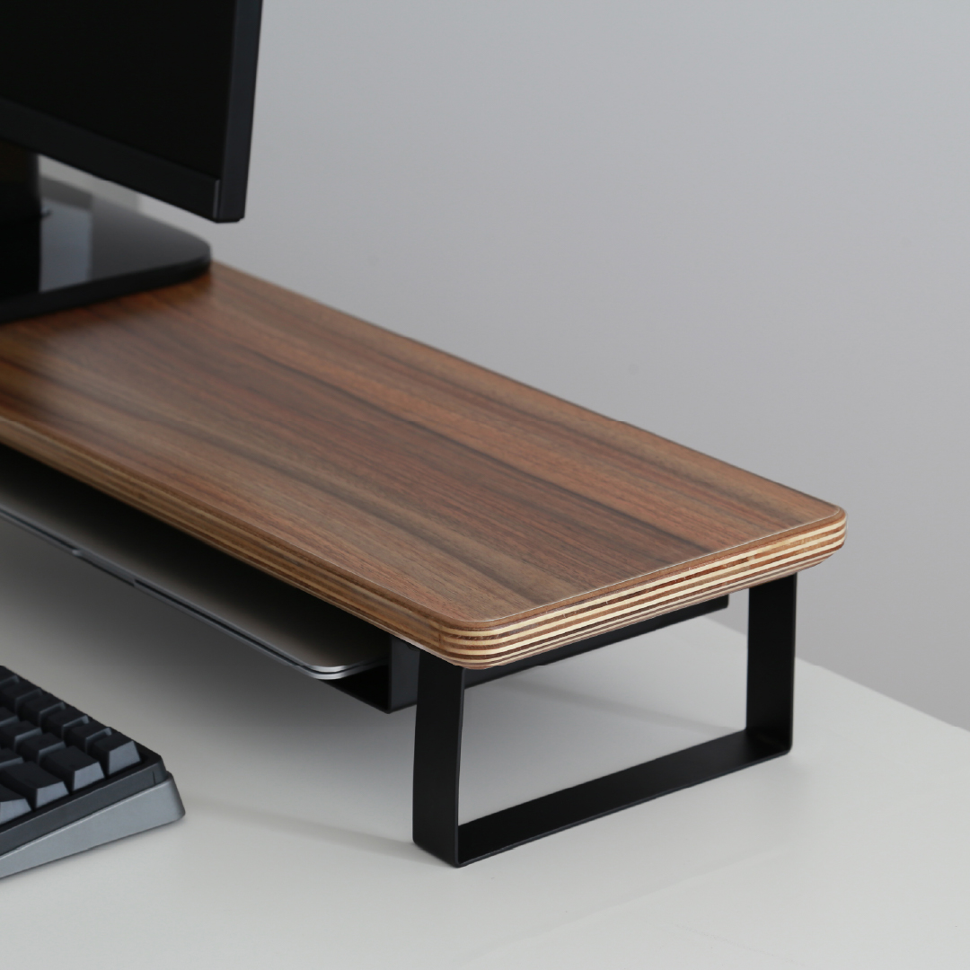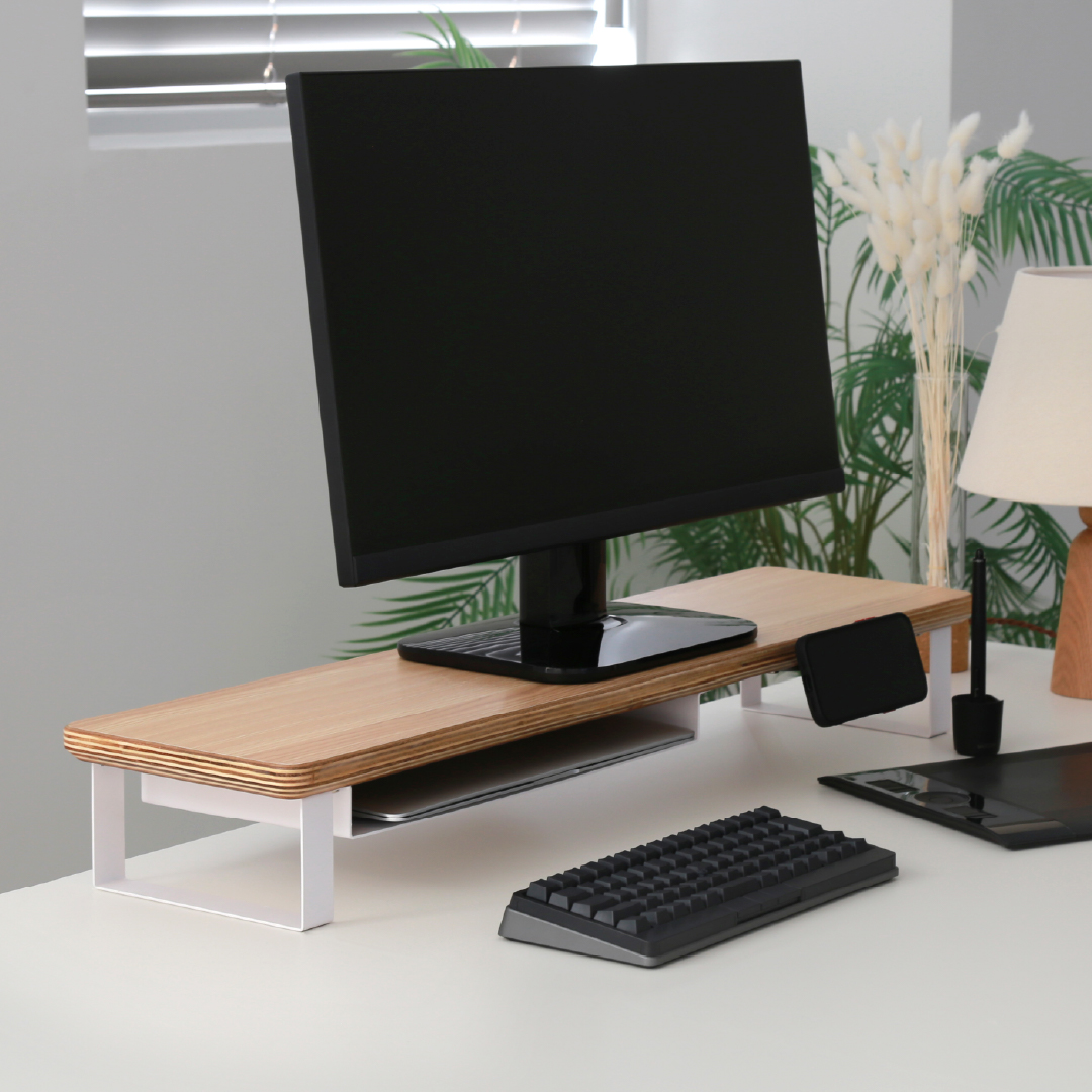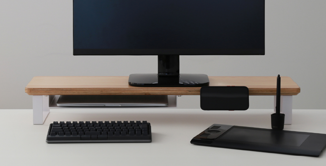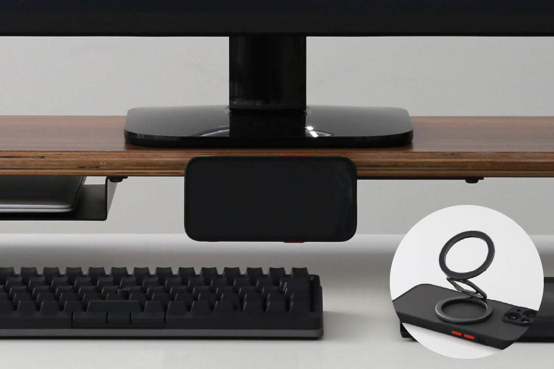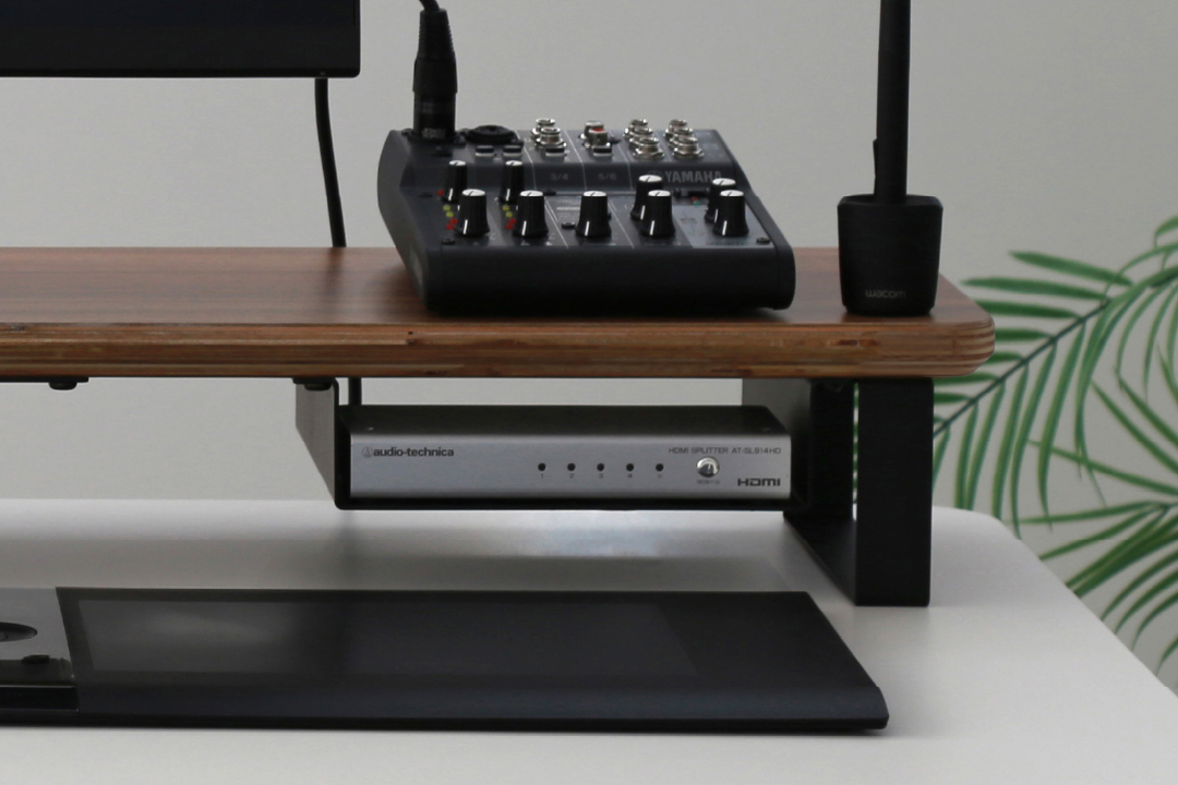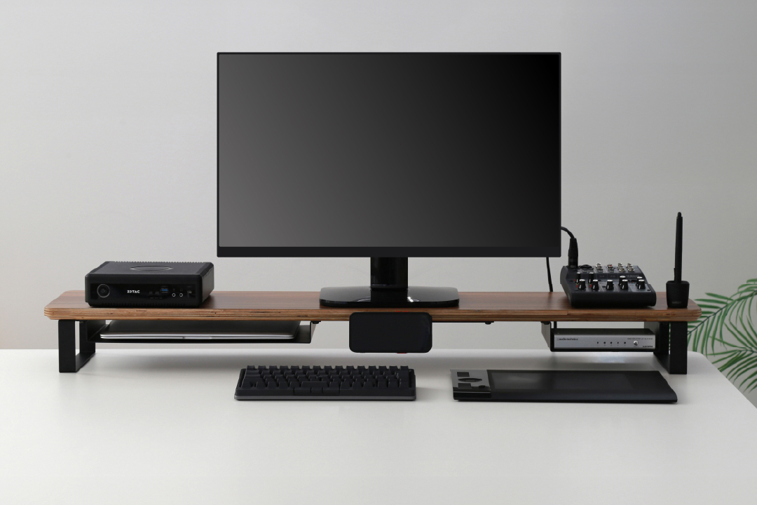 スマートフォンやガジェットなどの機材や小物を美しく収納できるデスクシェルフ/モニタースタンド。