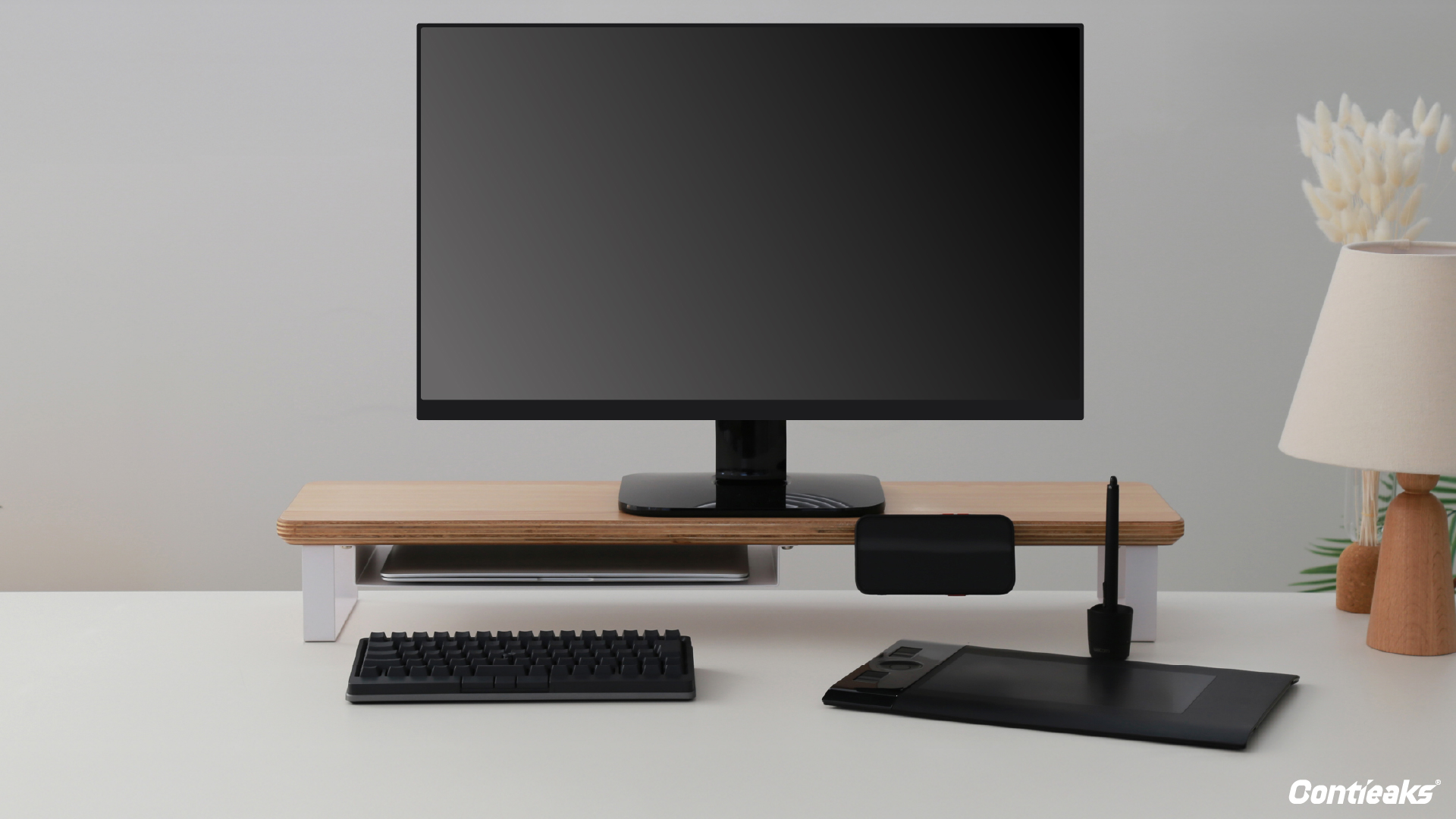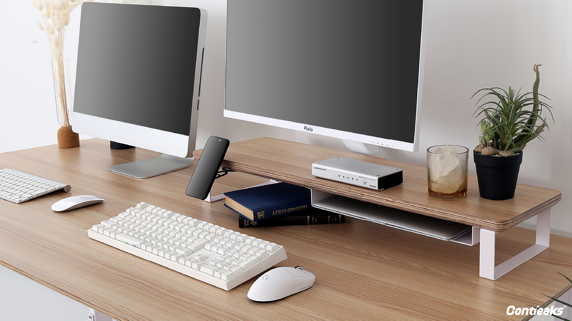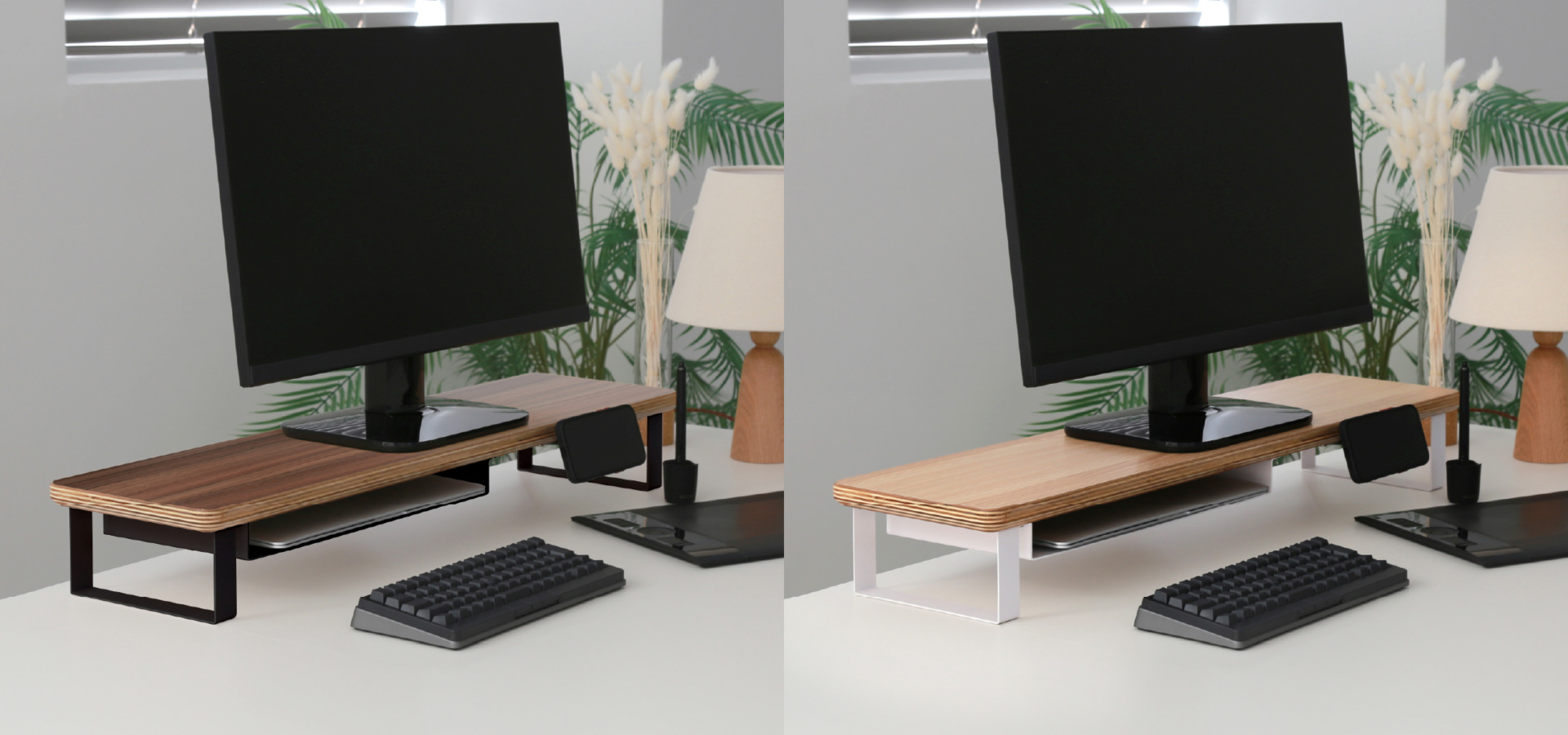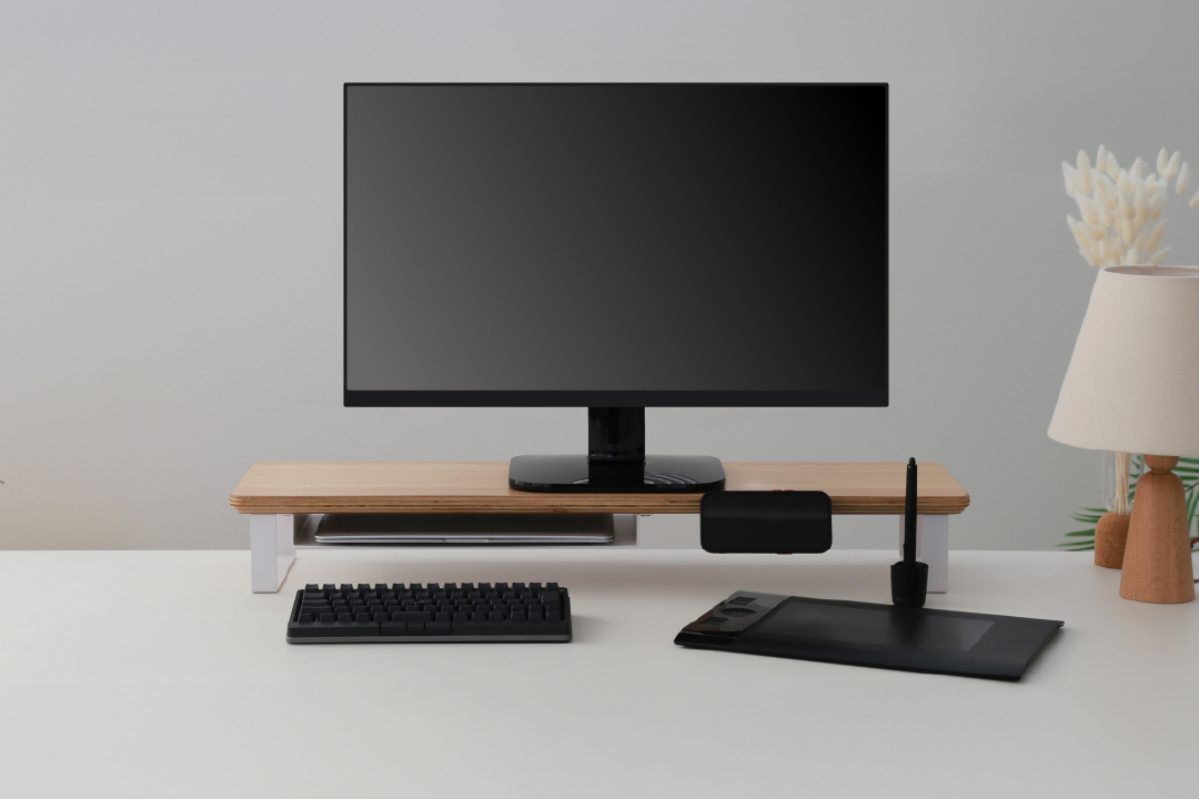 スマートフォンやガジェットなどの機材や小物を美しく収納できるデスクシェルフ/モニタースタンド。