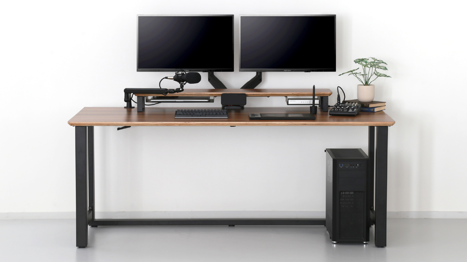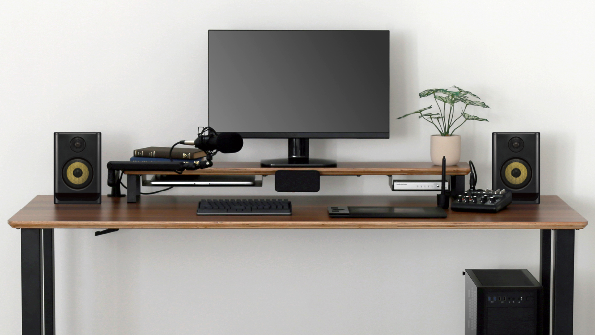 スペースに合わせ、ブックシェルフ型のスピーカーを両サイドに置いたり、モニター/マイクアームを取り付けたり、スペースがあることでさまざまな活用が可能になります。