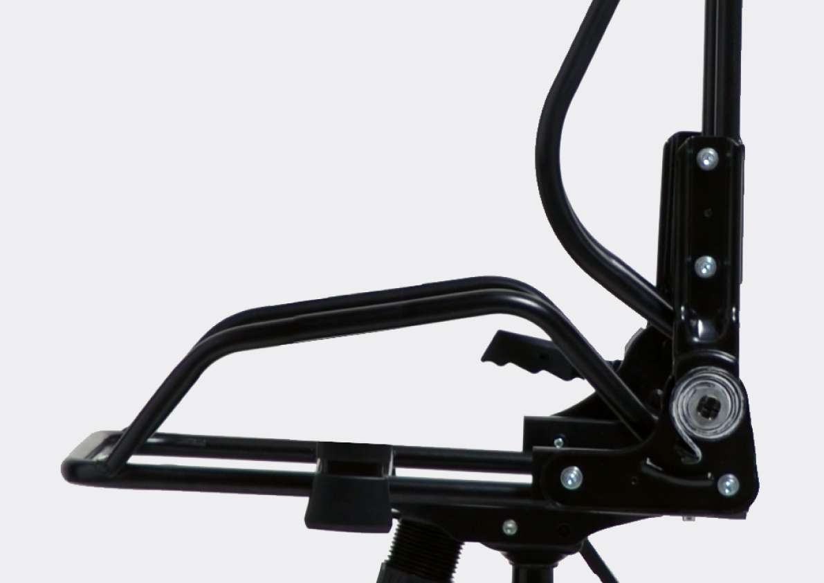 配信時や長時間使用した際、リクライニング部品のキシミ音がマイクに入り問題になる課題を緩和するためにギアとスプリングの機能を左右分離させた静音金具を独自に採用。