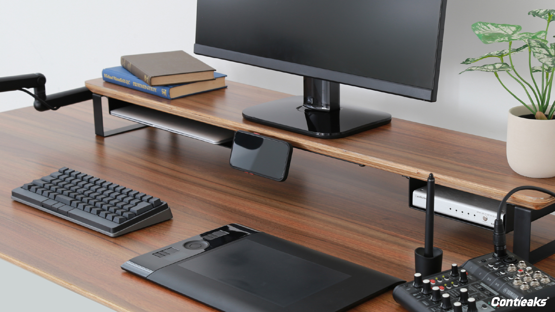 別売りでデバイスやガジェットを美しく収納できるデスクシェルフを開発。